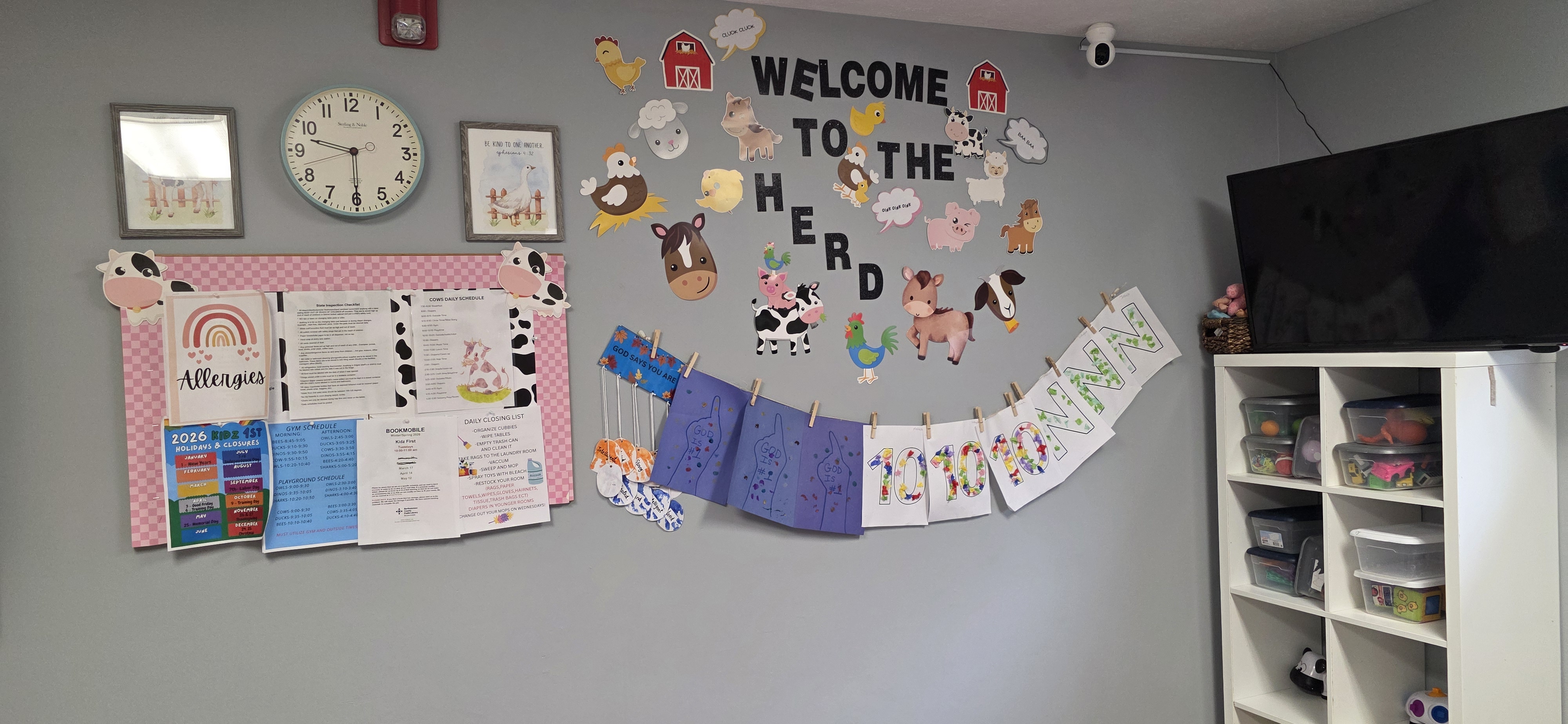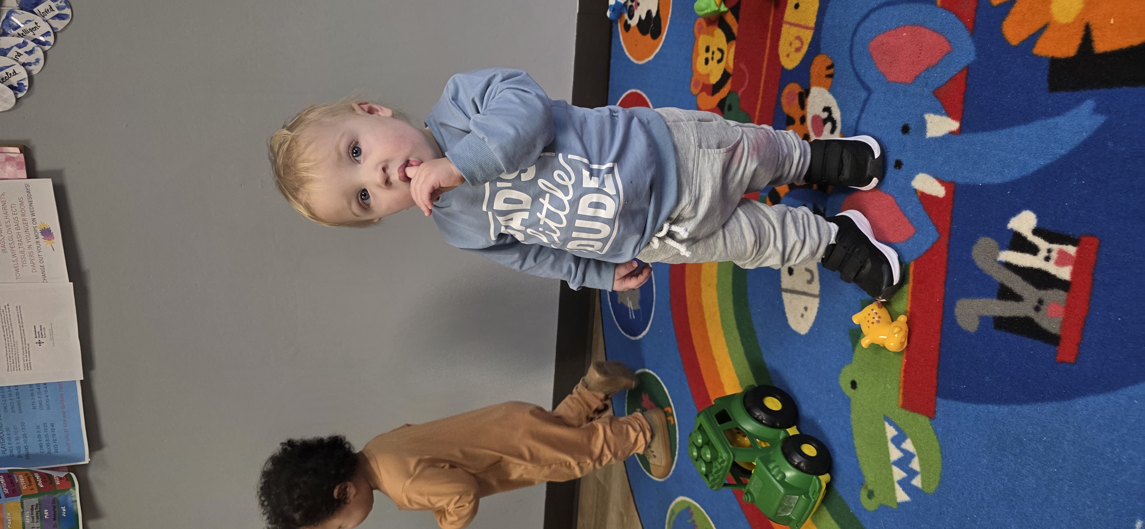 In our young toddler classroom, children begin exploring the world with curiosity and growing confidence. Teachers guide children through early language development, simple routines, and hands-on exploration that builds motor skills and social awareness. Through songs, stories, prayer, and intentional play, children develop trust, confidence, and early learning readiness in a safe and encouraging environment.